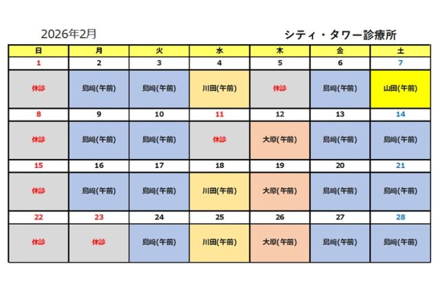 2/5(木)は休診です。2/14(土)の外来受付は10時45分までとなります。